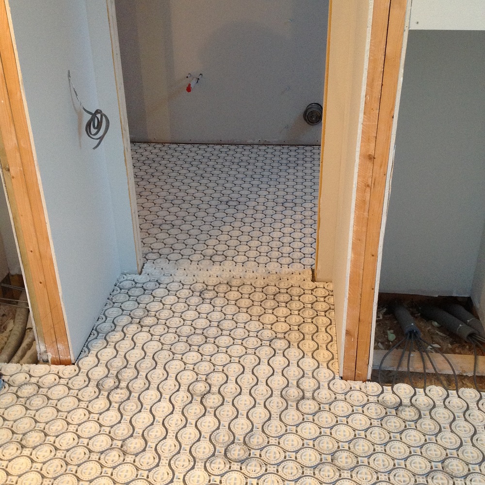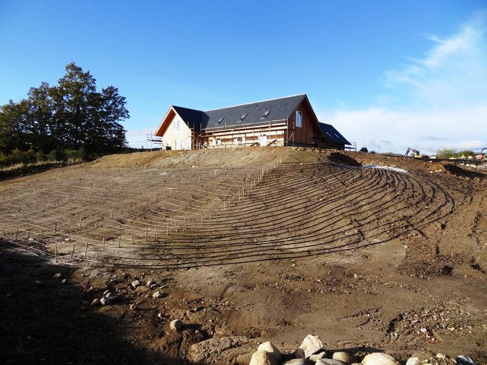 This 540m² new build near Alness has underfloor heating throughout. The ground floor is heated by a traditional underfloor heating system in a concrete screed. The first floor was originally to be heated by oversized radiators, however Barres suggested using the new low profile Me8nder system which had just been introduced to the UK. The Me8nder system comprises of 8mm PE-RT pipework clipped into rigid plastic mats. The total height of the me8nder system is 12mm and is finished off with a thin tile screed. The system has a quick reaction speed making it an ideal solution for first floors. An OCHSNER GMSW 28 Plus ground source heat pump was installed to provide heating to the building. This is coupled to an 800l TiSUN Pro Clean stratified tank which provides direct heating and domestic hot water. Connected to the heat exchanger is a three panel TiSUN solar thermal system.The energy for the heat pump is drawn from a 1200m x 32mm MDPE ground loop system. Rather than digging trenches, the client opted to excavate the entire area of ground required and the pipework was installed as you would an underfloor heating system. |