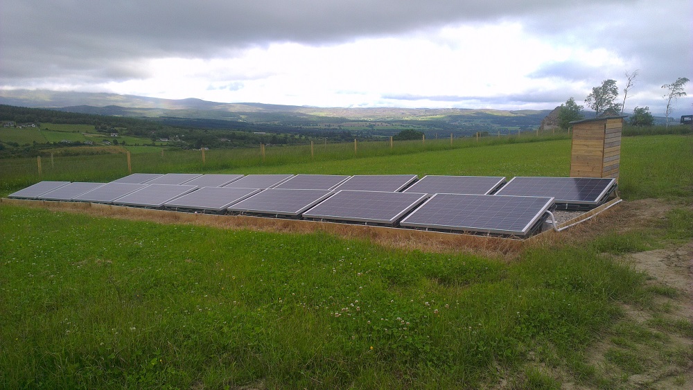 The Renusol consoles are 15° angled containers which were ballasted with gravel and rock. Each console allows the connection of one panel. No further anchoring is required. As the consoles are free-standing, it allowed the system to be orientated towards south to maximise the potential output of the system. To minimise losses, the inverter was mounted in a small wooden enclosure by the array. We have used this system on a number of projects now which require ground mounting.
