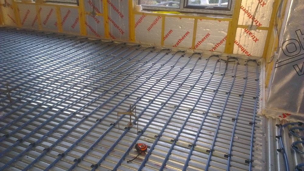 This property was originally heated by oil with radiators. We supplied underfloor heating for the new extension installed on a joisted floor using Duofor plates. Duofor plates are galvanised steel dovetailed sheets which are laid on top of the joists with the underfloor heating fixed on top and self-levelling screed to make up the finished floor. This system is ideal for use with a heat pump as it can run at very low temperatures allowing for a higher seasonal coefficient of performance. It also offers good sound-proofing and fire resistance. |