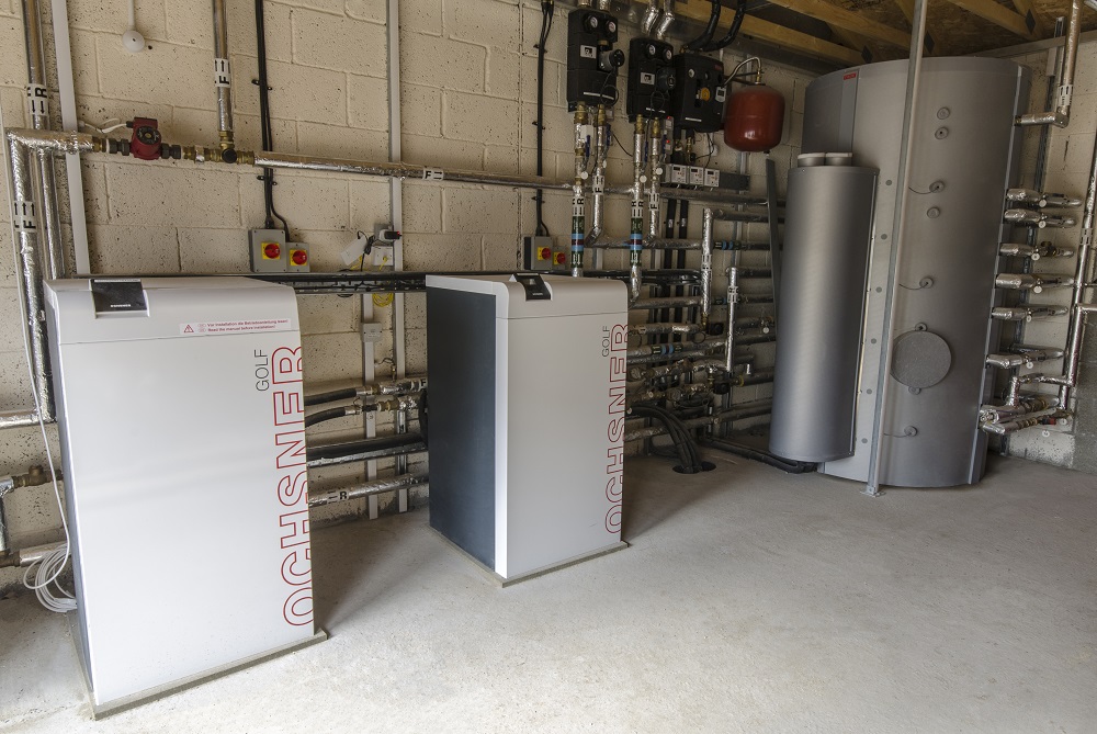 Two Ochsner GMLW 14kW air source heat pumps were fitted in a cascade, and connected to a 1500L Tisun Pro-Clean tank. The Pro-Clean tank is a combined buffer and domestic hot water tank, designed to be stratified allowing a higher temperature at the top for domestic hot water and cooler water at the bottom for the heating. The spherical solar heat exchanger on the side of the tank offers the unique feature that the solar heats from the top of the tank downwards, meaning that solar energy can be utilised quickly when it is available. |
